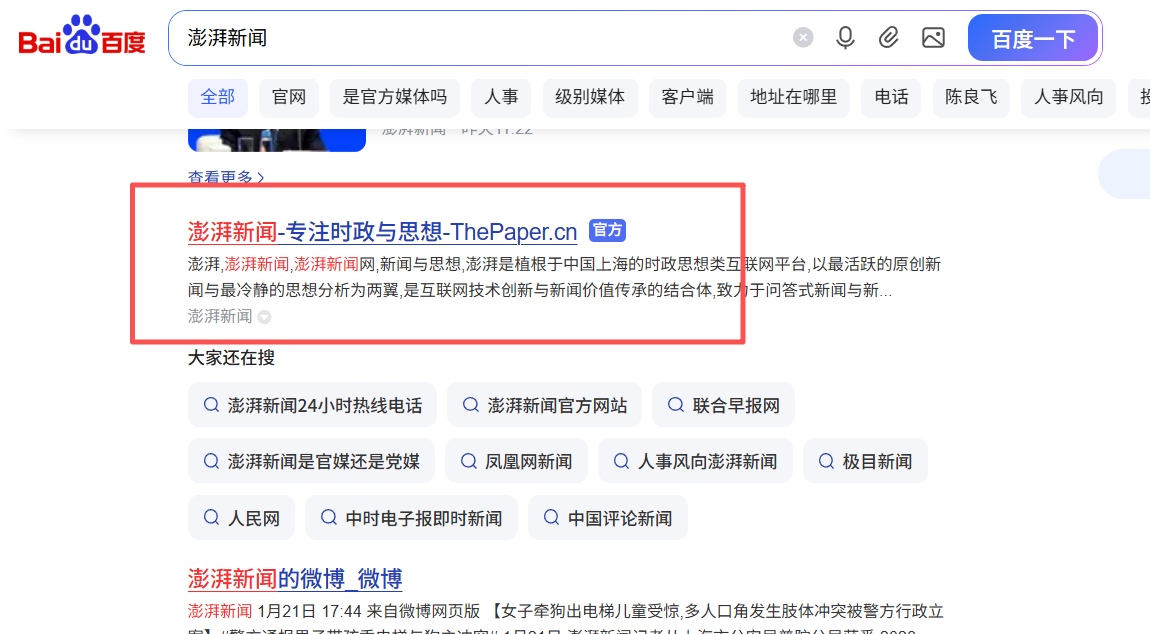 首先我们在百度查询"澎湃新闻"上官网去看是否有联系方式发稿通道。我们查看如下:
